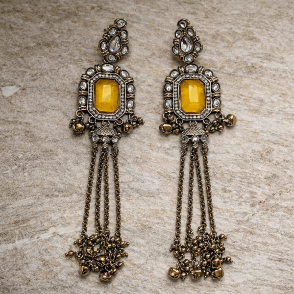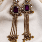 The antique oxidised tone enhances the intricate craftsmanship, while the flowing tassels create graceful movement — making these earrings a perfect choice for weddings, festive celebrations, and special occasions.
