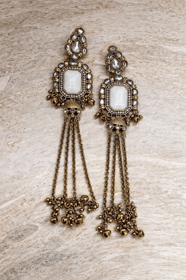 Elevate your festive and occasion styling with these beautifully detailed long tassel statement earrings from Lumina Jewels. Designed with a striking centre stone framed by delicate mirror style accents and finished with cascading chain tassels, this elegant pair blends traditional charm with modern statement appeal.