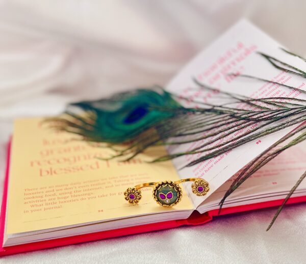 A delicate adjustable ring with traditional floral and peacock inspired detailing designed to add a graceful ethnic touch to any outfit.