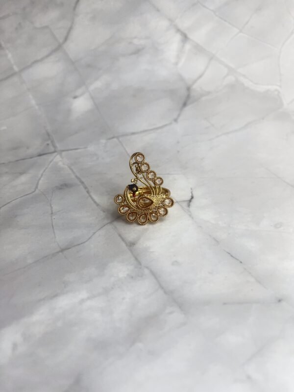 Add a royal touch to your look with this intricately designed peacock ring, finished in antique gold. Adjustable, elegant and timeless- perfect for festive occasions, weddings, or adding a hint of tradition to everyday style.