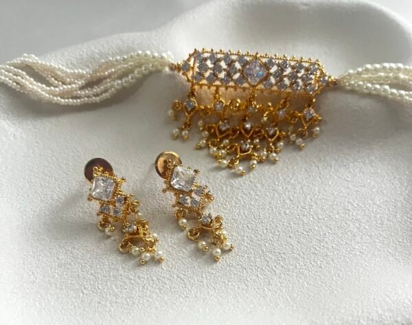 Designed with multiple strands of luminous pearls and intricate crystal detailing, this piece blends classic elegance with a modern edge. The structured centre design adds just the right amount of drama, making it perfect for festive celebrations, special occasions, evening events or elevated traditional outfits.