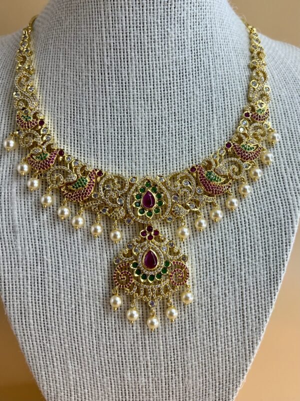 Make a statement with this exquisite traditional  jewellery necklace set, designed for grand festive occasions. Crafted in a rich gold-plated finish, this intricately detailed Indian set features vibrant ruby pink and emerald green stones, delicate pearl drops, and a beautifully ornate pendant inspired by classic South Indian jewellery designs.