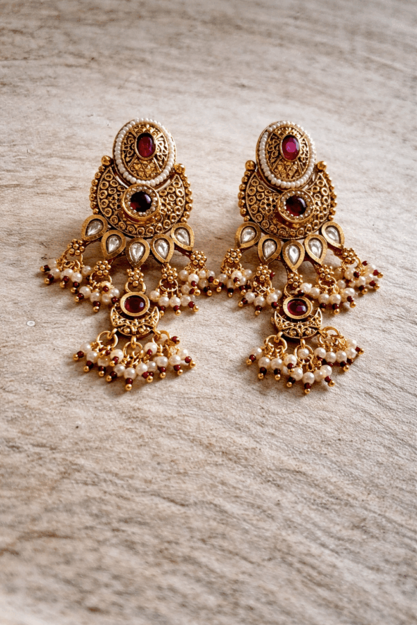 Crafted in a rich antique gold finish, this striking choker features deep ruby-tone centre stones, intricate kundan-style detailing, and elegant pearl drop accents that create graceful movement and royal charm. The structured neckline design frames the collar beautifully, making it perfect for sarees, lehengas, anarkalis, and contemporary fusion outfits.