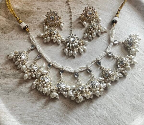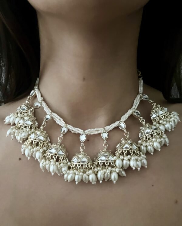 Featuring delicate layered pearl strands along the neckline and beautifully detailed jhumki inspired drop elements, this necklace creates a soft yet eyecatching silhouette. The mirror-style stone accents paired with cascading pearl drops add movement and charm, making it perfect for weddings, celebrations, and special occasions.